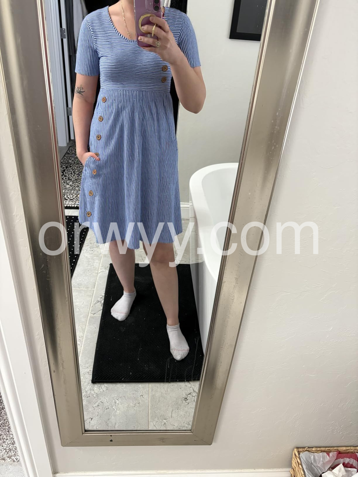 I absolutely love this dress! The pockets are a huge plus for me. The blue and white stripes are so classic for summer, and the material is really lightweight and breathable. Highly recommend!