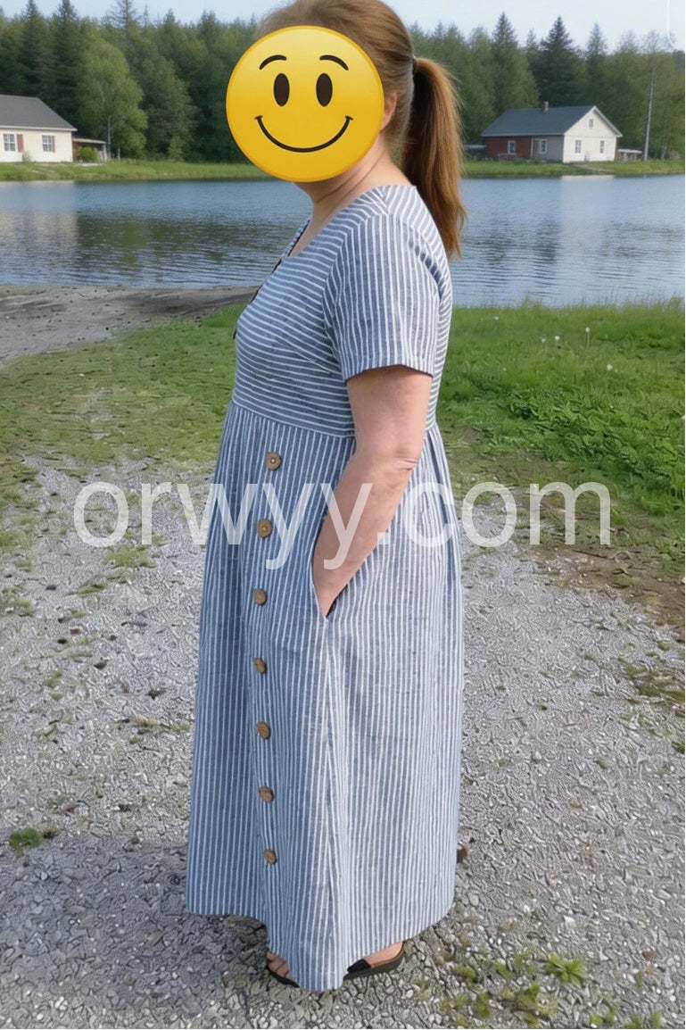 This dress is absolutely perfect! The blue and white stripes are so classic and the buttons add a nice touch.