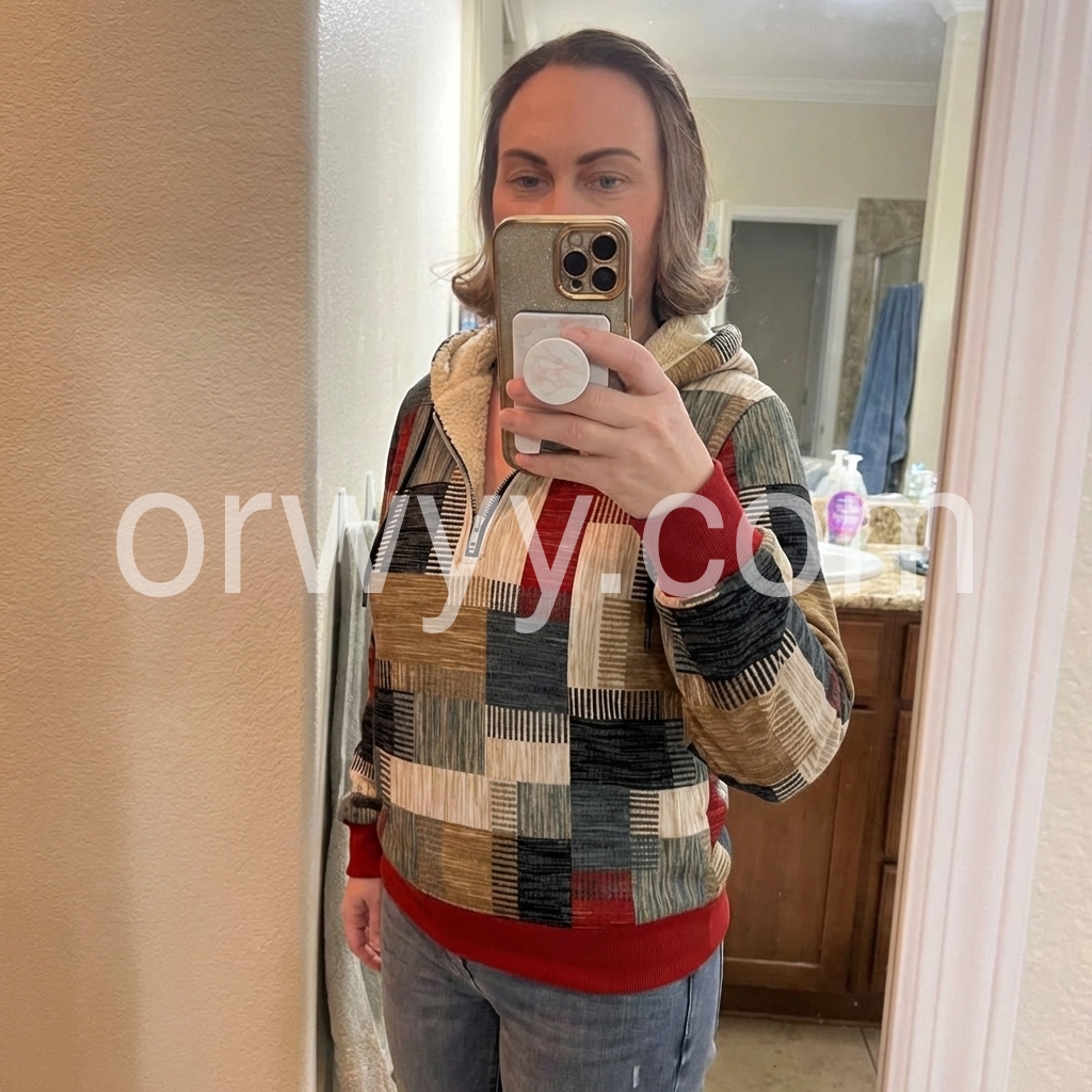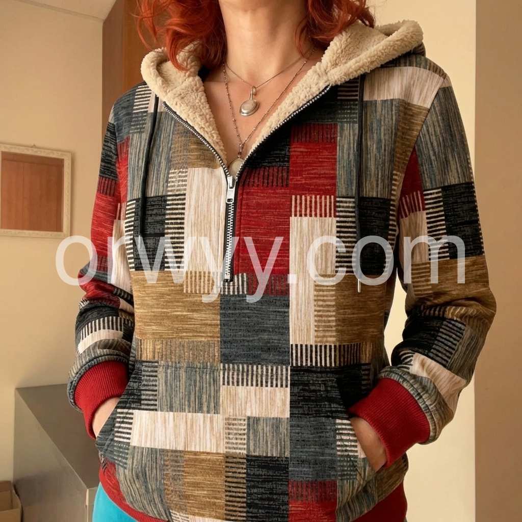 I bought this zip-up top for a casual weekend look, and it exceeded my expectations. The patchwork-style design is unique and modern, and the colors are well-balanced rather than overwhelming. The collar adds that cozy touch, and the overall construction feels solid. It’s easy to pair with jeans or leggings, and it looks great in every lighting situation.