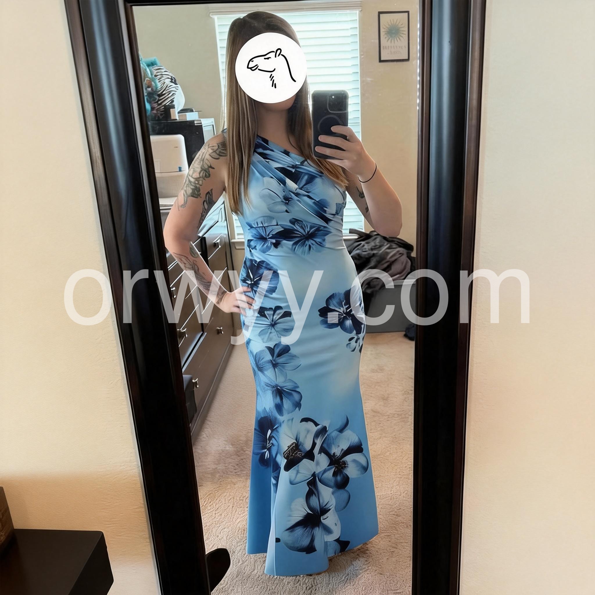 The shades of blue in this dress are absolutely breathtaking. It has a slight mermaid flare at the bottom that makes it very easy to walk in. Very sophisticated and classy.