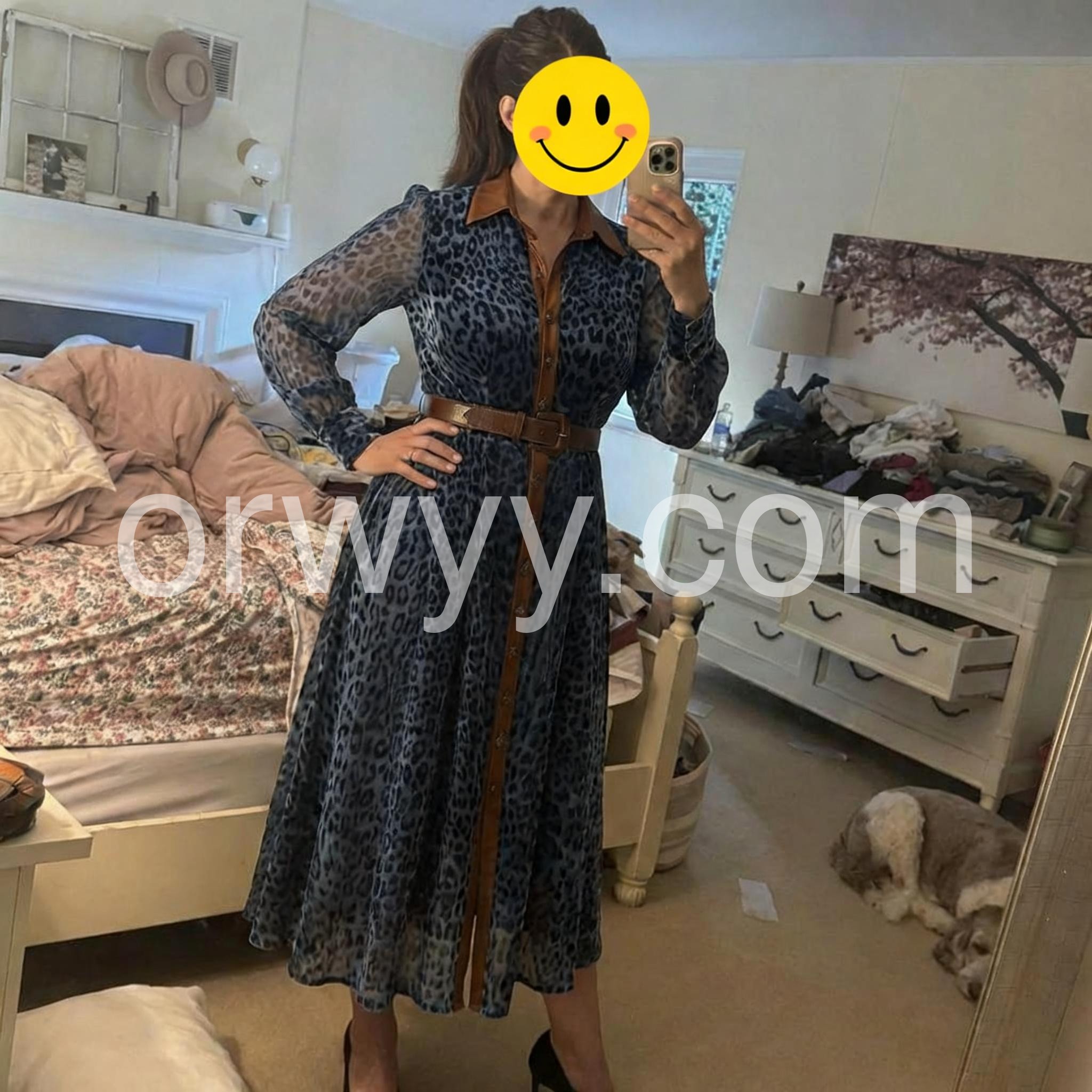 The contrast between the blue leopard print and the brown leather-like collar and belt is brilliant. It is a very fashion-forward piece. I paired it with a brown handbag and got stopped on the street by someone asking where I bought it.