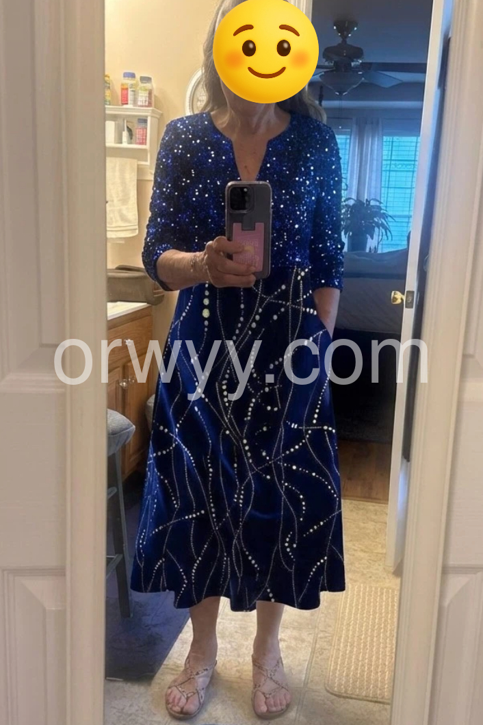 Such a beautiful navy blue dress. I bought it for a cruise elegant night and it was perfect. The material has a nice weight to it so it hangs beautifully. Plus, pockets!