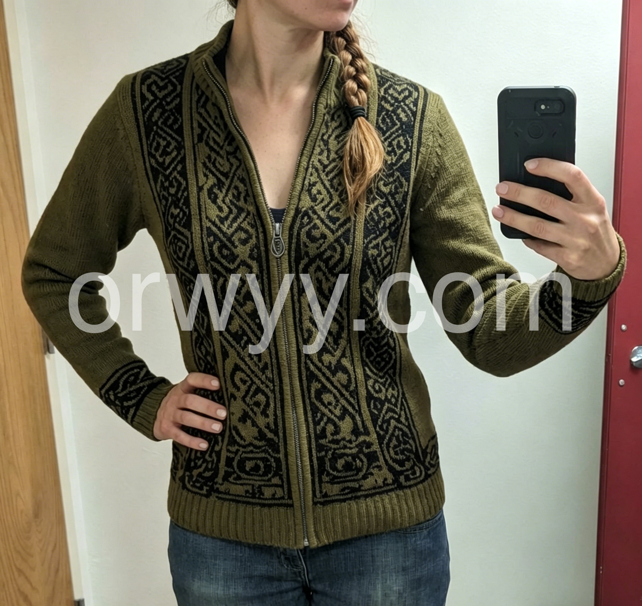 I’m obsessed with this vintage-style knit jacket! The earthy olive hue and ornate Nordic-inspired pattern feel so timeless and unique, way more interesting than basic sweaters. The wool-blend fabric is incredibly soft and insulating, perfect for layering over tees or turtlenecks. The fitted silhouette flatters my figure without being tight, and the silver zipper adds a sleek, polished touch. It’s become my go-to for weekend hikes, coffee runs, and even casual date nights—versatile, stylish, and so cozy!