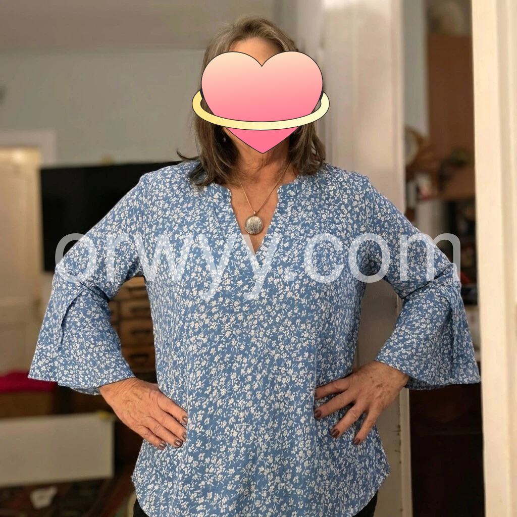 I really love this top. The blue color is lovely, and the small floral print looks so pretty. The V-neck is flattering without being too low, and the three-quarter sleeves are a great length. The fabric feels soft and comfortable, and the fit is flattering and easy to wear. It matches the photos well and has quickly become one of my go-to blouses.