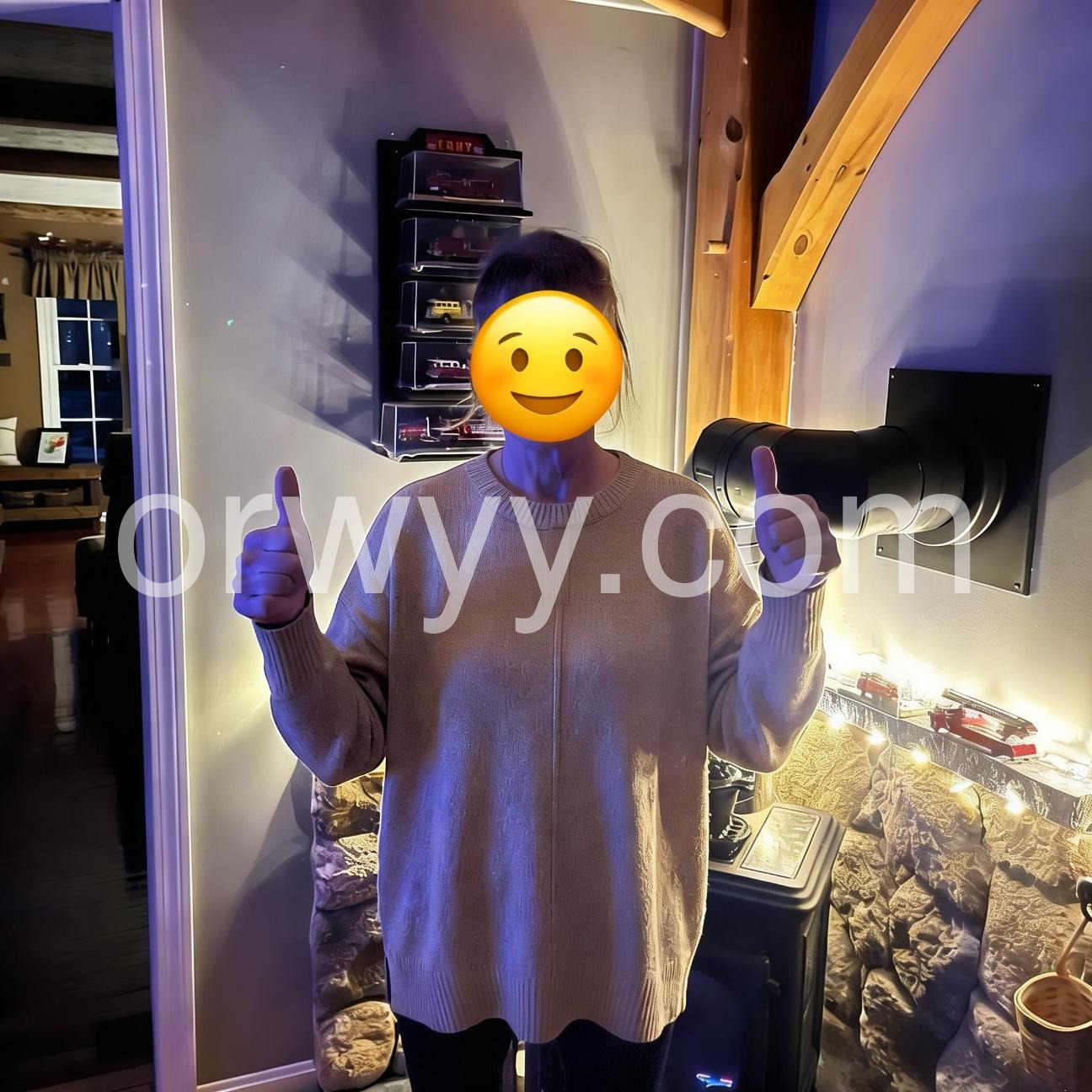 Nice longish sweater! Soft and TTS! The length and width are forgiving and not form fitting. The sweater falls to the hip bone.