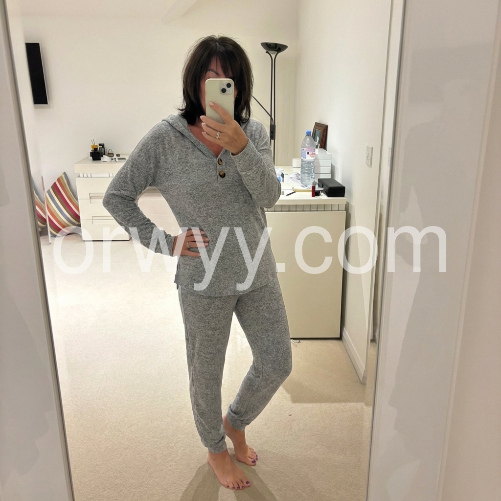This loungewear set is the coziest thing I own! The hooded top is soft and lightweight, the buttons are a cute detail, and the joggers fit perfectly without being tight. The fabric is breathable and warm enough for chilly nights, and I love the side slits on the top for extra comfort. I wear it around the house all the time.