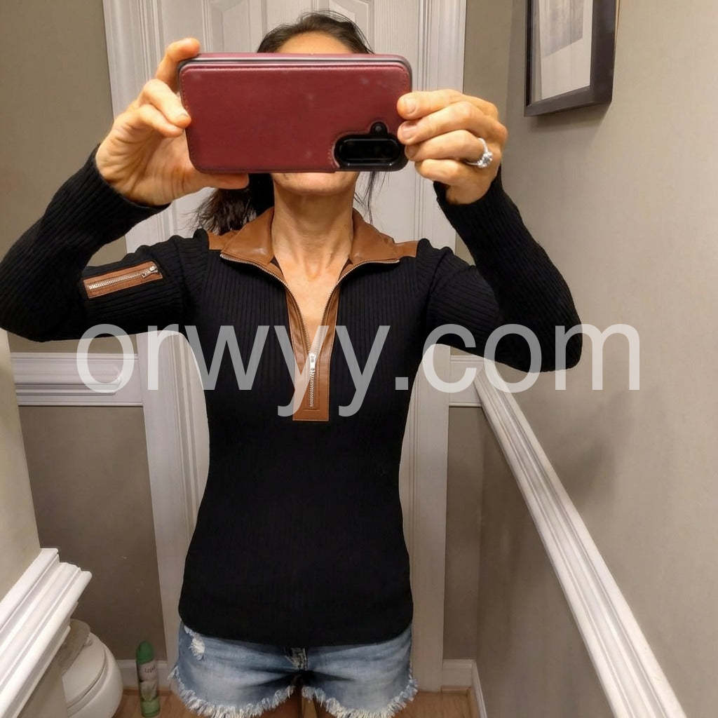 Absolutely love this top! The brown leather-like trim around the collar and zipper gives it such a high-end look. The ribbed material is stretchy and super comfortable. Highly recommend!