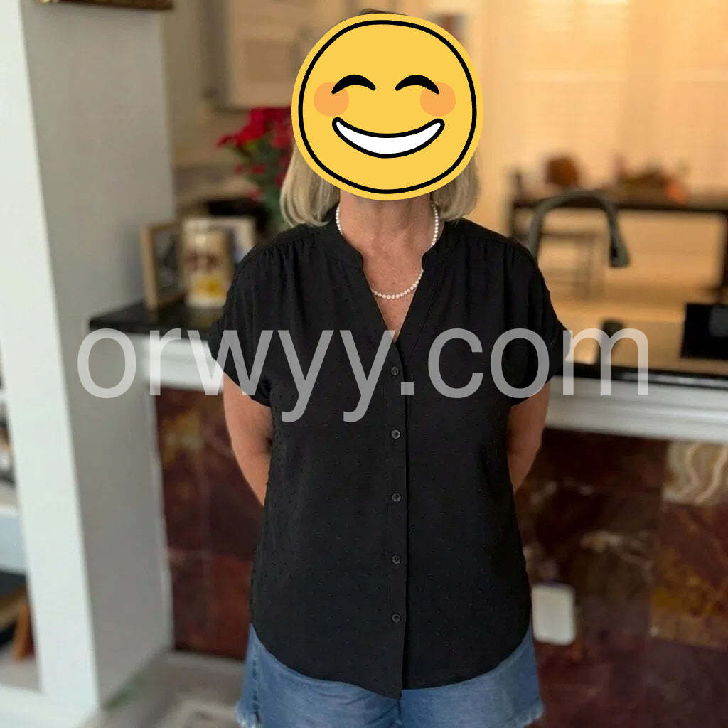 Get back to basics with this simple black top. Buttons down the front with a fold-over collar lend a classic vibe, upgraded with modern short sleeves rolled up for a casual look. Tuck this black blouse in with jeans or a skirt, or leave it out for a flowy style.