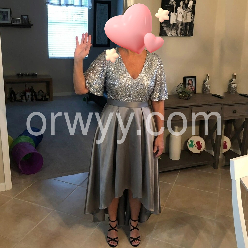I absolutely love this dress! The silver sequins are gorgeous and really catch the light, and the V-neck looks so flattering. The skirt has a beautiful flowing shape and it feels comfortable to wear. I wore it for a special event and got so many compliments—looks exactly like the photos. Great quality!