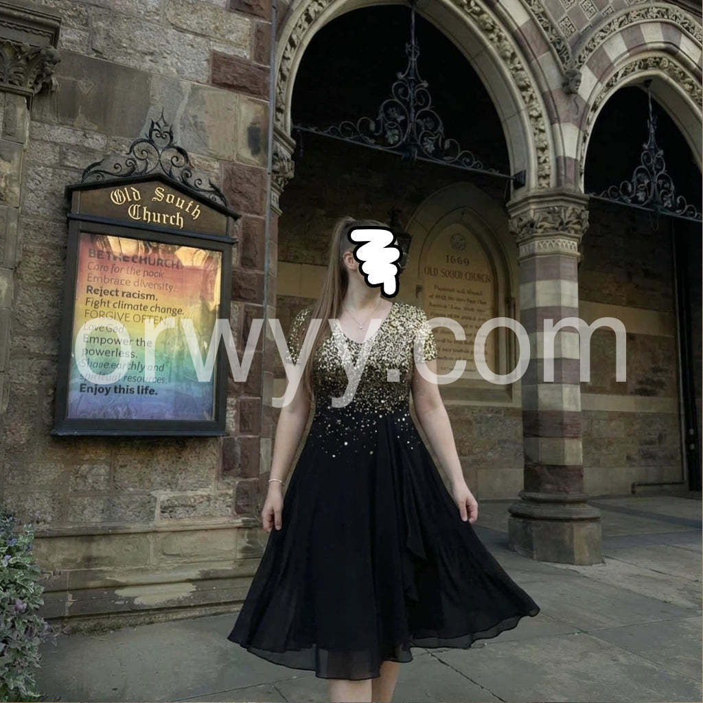 Beautiful dress for a holiday party! The sequins on the bodice catch the light perfectly without looking cheap. The skirt drapes beautifully and hides any tummy insecurities. I ordered my usual size and it fit like a glove. Will definitely buy from this brand again.