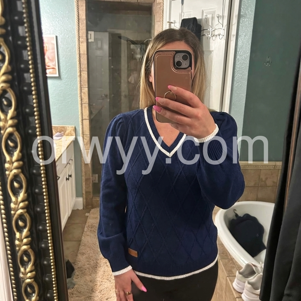 I’m obsessed with this chic navy sweater! The textured diamond pattern elevates it way beyond basic tops, and the contrast white piping makes the design pop. I’ve worn it to the office with slacks and on weekends with jeans—it’s versatile enough for every occasion, and it’s quickly become my go-to fall sweater!