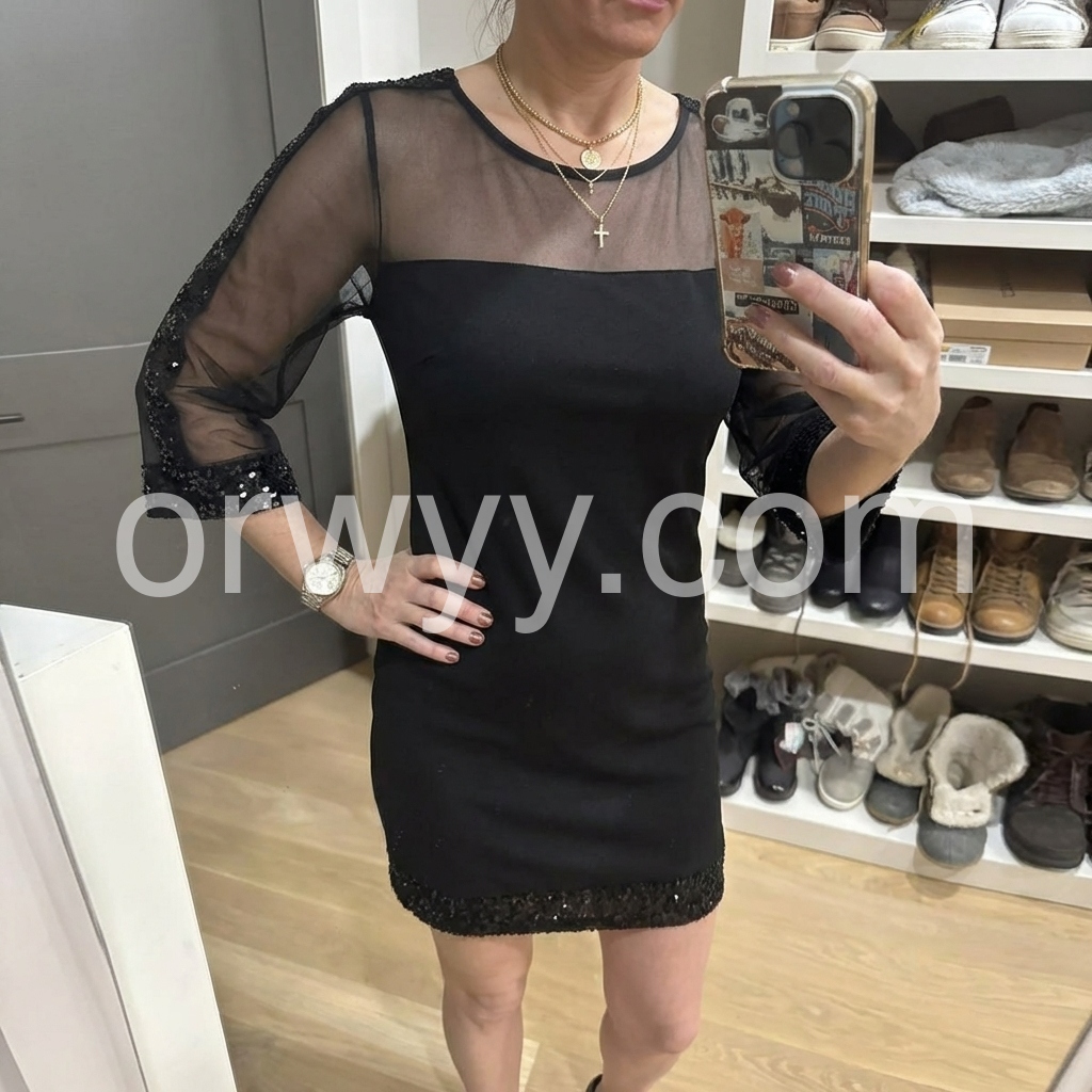 Elevate your evening look with this striking black mini dress, where sheer sleeves create an alluring contrast against the fitted silhouette. The sequined hem catches light with every movement, delivering sophisticated sparkle without overwhelming the design. Perfect for cocktail events or upscale nights out, this piece balances elegance with contemporary edge. The sheer sleeve detailing adds dimension while maintaining a refined aesthetic, making it versatile enough to transition from dinner to dancing.