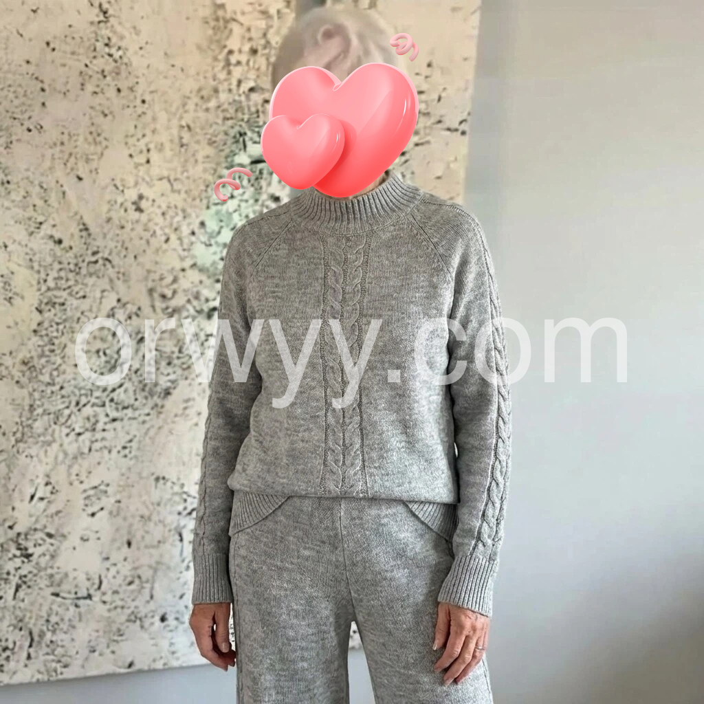 This is such a comfortable knit set. The sweater is cozy and the high neck cable pattern is beautiful. The matching pants fit nicely and feel smooth and soft. I’ve worn it around the house and also for running errands always looks great. It matches the listing pictures perfectly and I’m very happy with it.