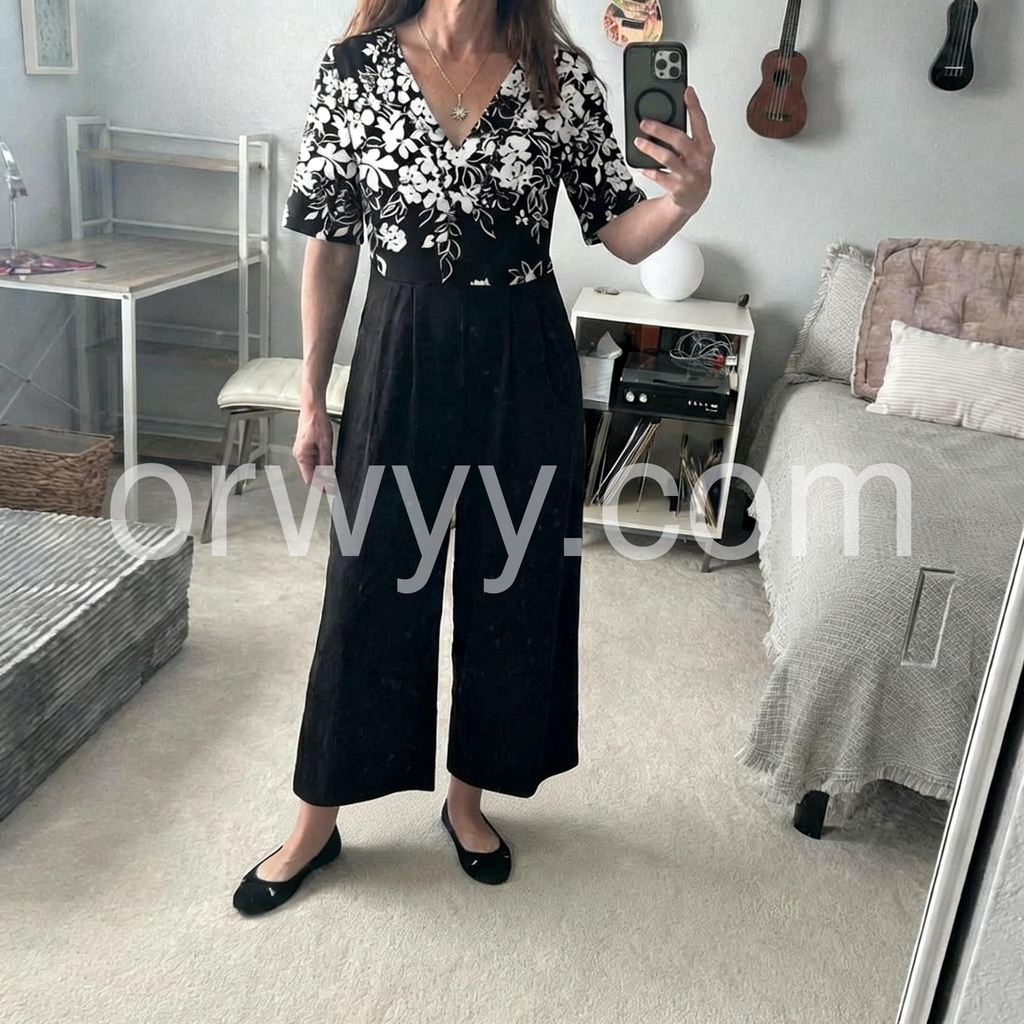 This is my new favorite outfit. The V-neck and the way the floral pattern fades into the solid black pants gives it such an elegant look. Fits true to size and the material is really soft.