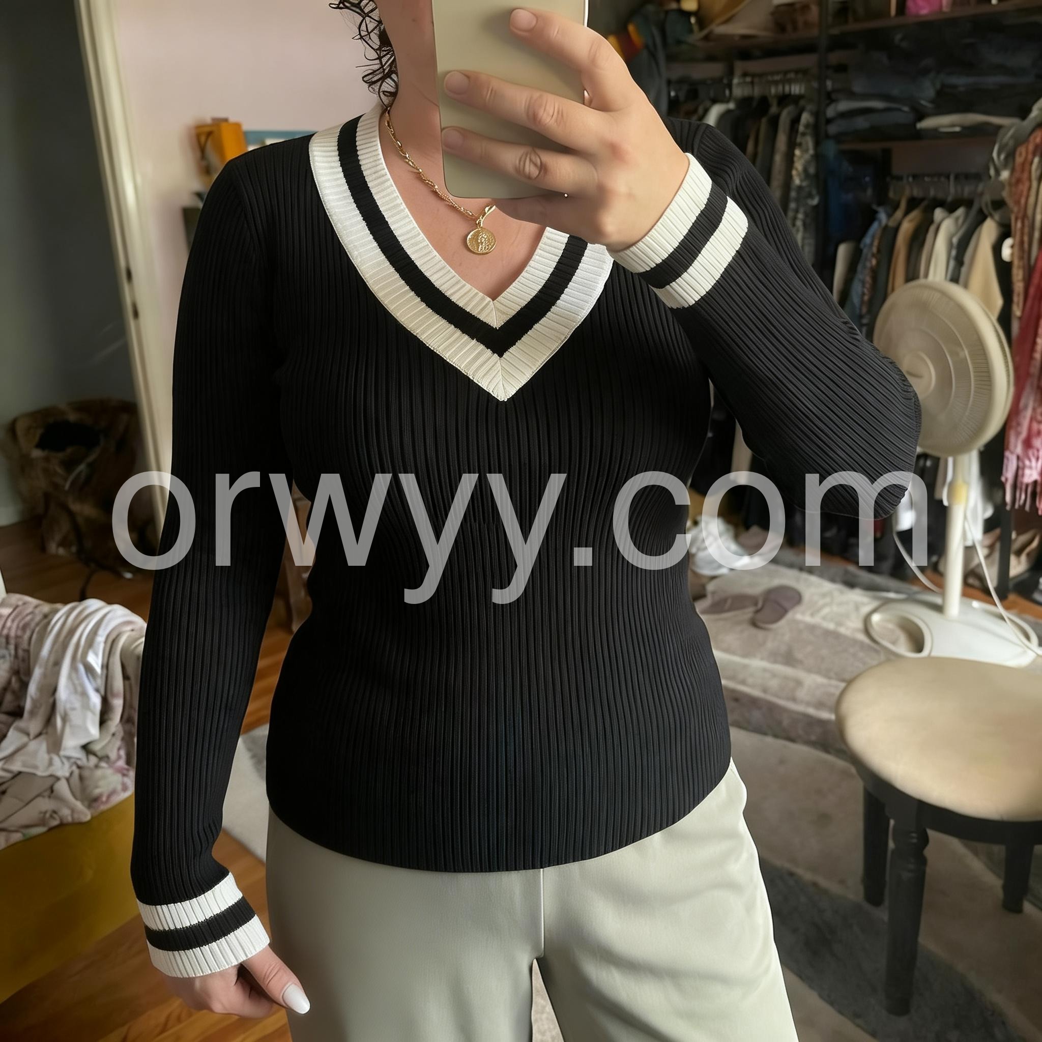 I’m obsessed with this design! The contrasting stripes at the collar, cuffs, and hem give it such a chic, timeless vibe without looking overly busy. The fit feels smooth and well-shaped, and the long sleeves are perfect for cooler weather. I also appreciate how the sweater holds its form after wearing, so it doesn’t look messy. It’s become one of my go-to pieces already.