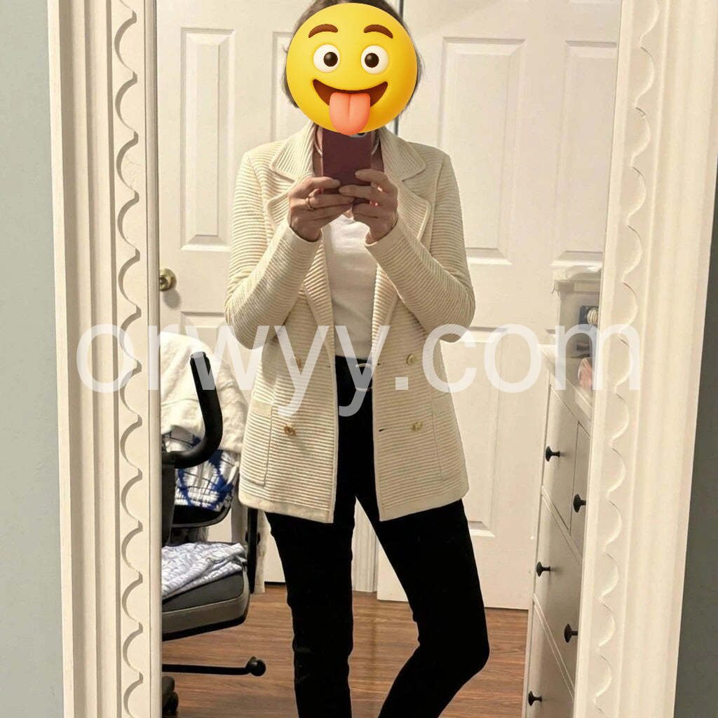Very impressed with the quality of this sweater. It feels heavy and well-made, not flimsy at all. The double-breasted design is super trendy right now.