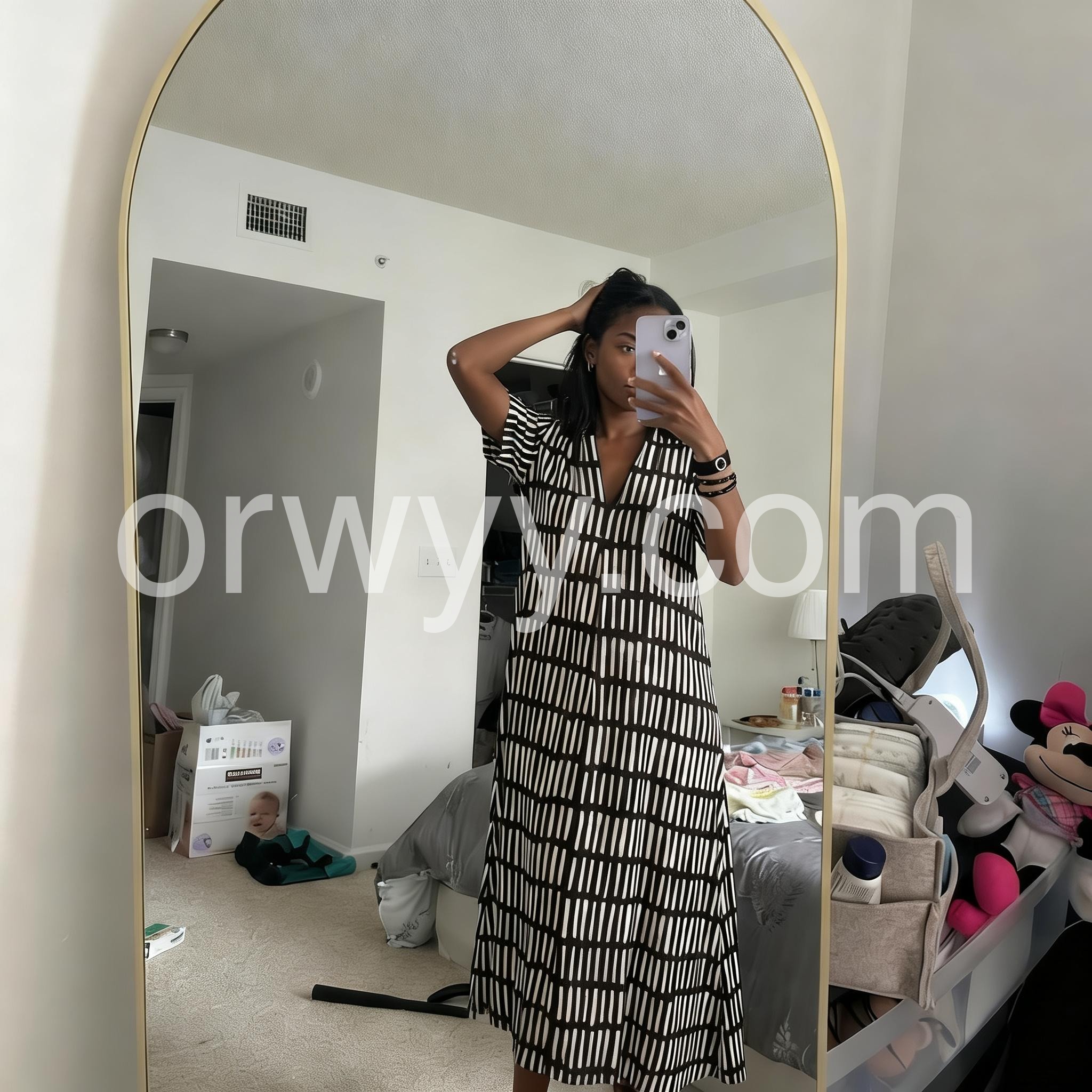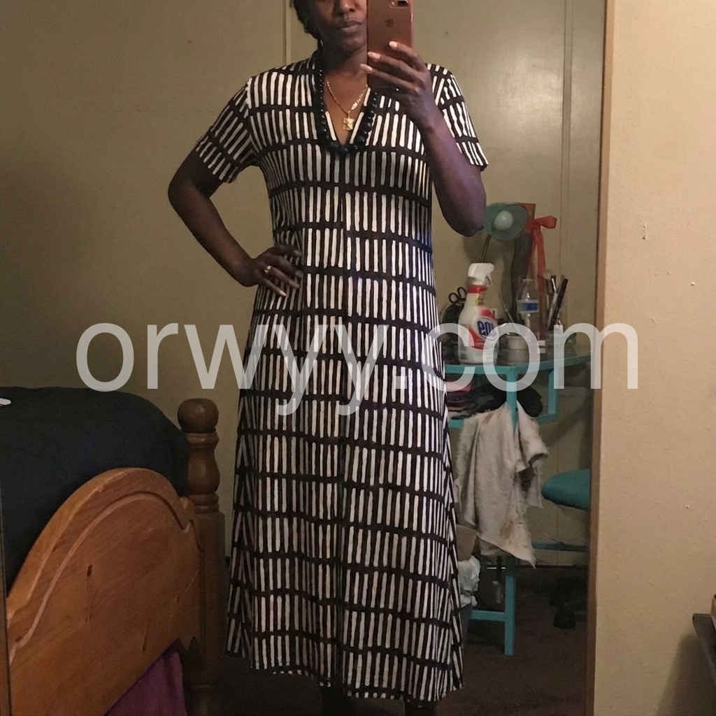 I’m absolutely in love with this dress! The black and white pattern is so stylish and flattering, and the fit feels comfortable and easy to move in. I wore it to a casual get-together and received so many compliments. The length is perfect elegant without being too formal.