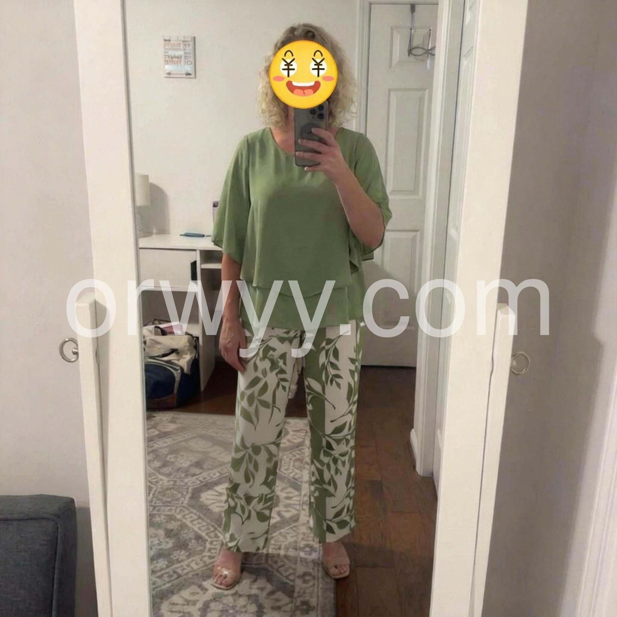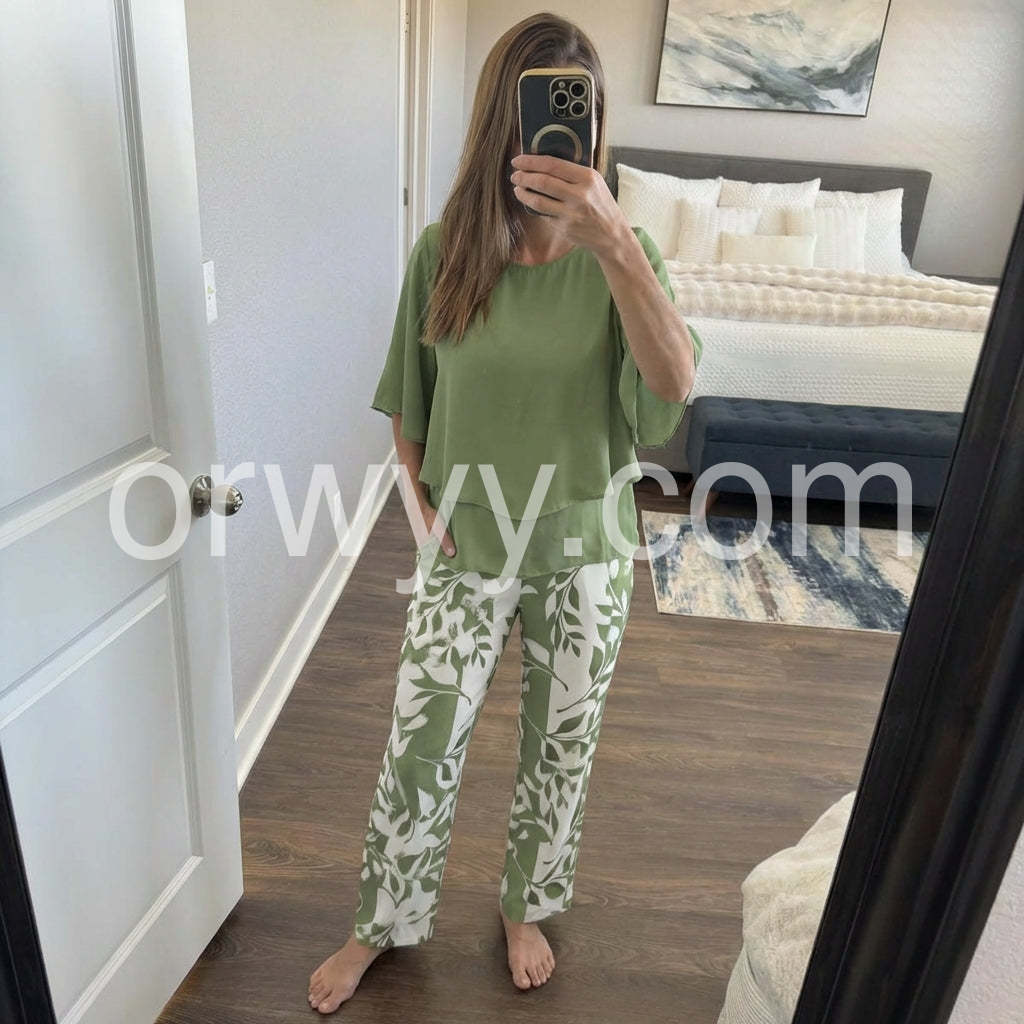 I absolutely love this two-piece set! The flowy green top is so flattering and completely hides my tummy, while the leaf print pants are incredibly comfortable. True to size and perfect for my upcoming cruise.