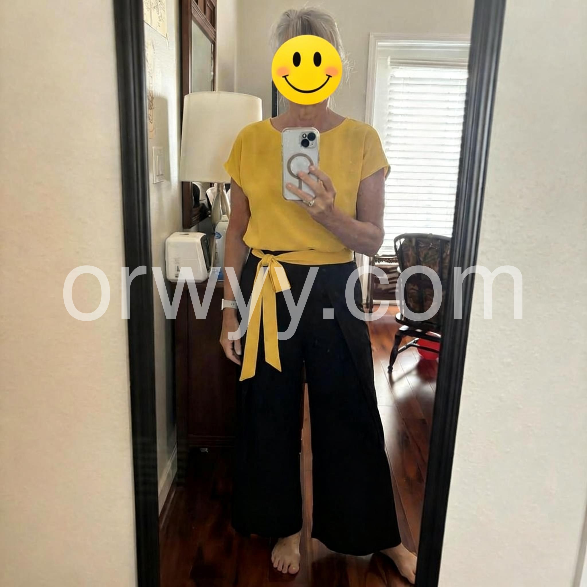 Love the bold color combo! The mustard-yellow top is airy and flattering, and the wide-leg black pants with the yellow waist tie create a chic, modern silhouette. Perfect for casual days out.